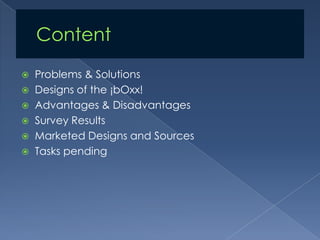 The document describes the design of the ¡bOxx!, a portable and compactable storage box created by students to address common problems encountered when carrying school supplies. The initial design of the ¡bOxx! included separate compartments and the ability to fold flat. Based on feedback, the design was improved to include a handle and durable materials. Pending tasks include sourcing cardboard, getting help to construct a prototype, and further refining the design based on surveys and identifying flaws.
