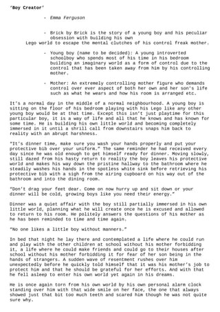 - The story follows a young boy who escapes his controlling mother by building elaborate Lego worlds in his bedroom. His mother demands control over every aspect of his life and tears him away from his Lego creations each night.