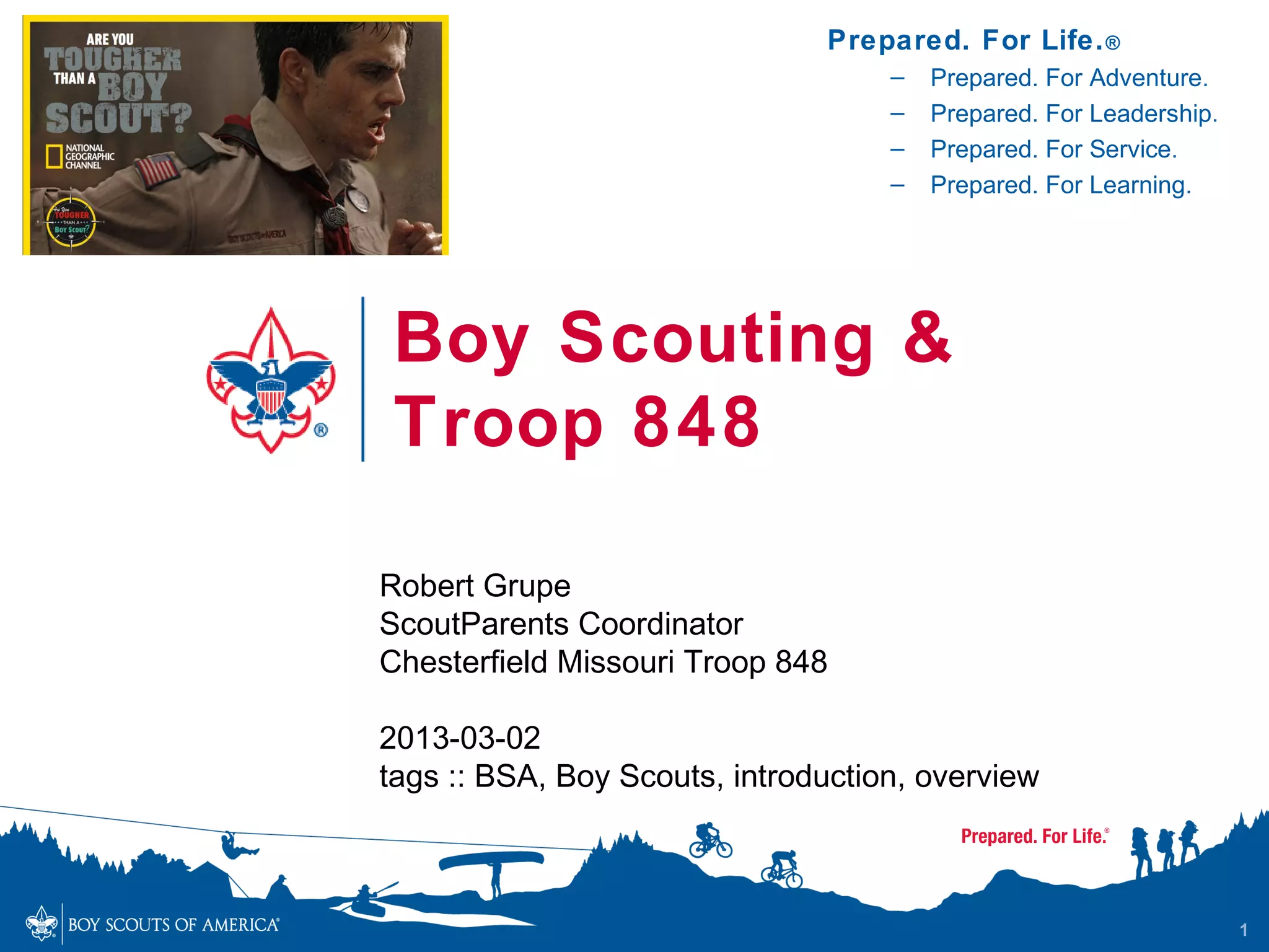 The document provides an overview of the benefits of Boy Scouting including developing outdoor skills, leadership, community service, and recognition. It outlines the advancement path from early ranks through Eagle Scout and describes various merit badges, activities, and awards. Finally, it provides details about Troop 848 including leadership, activities, and rules.