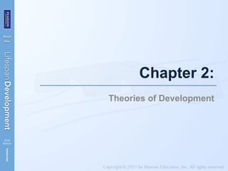 This chapter discusses several major theories of child development including psychoanalytic, learning, and cognitive theories. Psychoanalytic theories proposed by Freud and Erikson focus on internal drives and resolving psychosocial crises. Learning theories such as classical and operant conditioning examine how behaviors are influenced through reinforcement. Cognitive theories proposed by Piaget and Vygotsky consider how children acquire and construct knowledge through social interactions and experiences. Biological and ecological theories also influence understanding of child development. The chapter emphasizes evaluating theories based on their usefulness rather than labeling them as right or wrong.