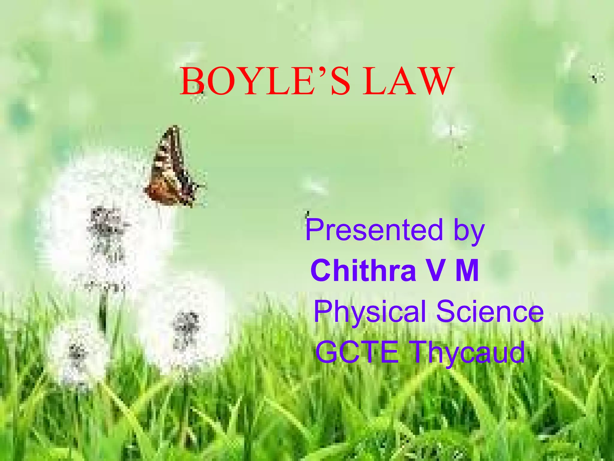 This document explains Boyle's law, which states that the volume of a gas varies inversely with pressure when temperature is kept constant. It provides examples of how Boyle's law applies to balloons expanding with decreasing pressure, and gas compressing into a smaller volume under increasing pressure. Mathematical and graphical representations of the inverse pressure-volume relationship are also presented.