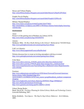 This document provides resources for promoting reading among teenage boys, including articles, websites, displays, and suggestions for creating an inviting library environment. Specific resources mentioned include websites focused on motivating boys to read, lists of audiobooks for young adults, ideas for book displays, suggestions for making the physical space appealing to boys through gaming areas, furniture, and paint colors, and recommendations for graphic novels, board games, and video games suitable for libraries.