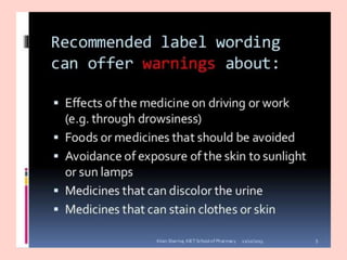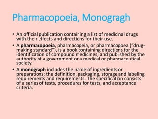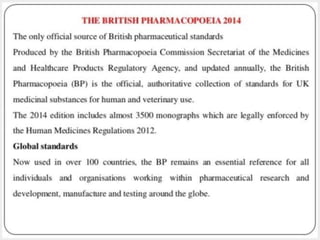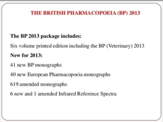The British Pharmacopoeia is the national pharmacopoeia of the UK and is published annually. It contains quality standards for UK medicinal substances and includes monographs on ingredients, preparations, packaging and other requirements. It has multiple volumes covering medicinal substances, formulated preparations, appendices and indices. The appendices provide information on interactions, borderline substances, cautionary labels and wound management products. It is used by healthcare professionals in the UK as an official reference for pharmaceutical substances and preparations.