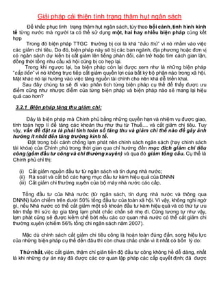 Tài liệu phân tích các biện pháp cải thiện tình trạng thâm hụt ngân sách, bao gồm giảm chi tiêu, tăng thu, vay nợ, sử dụng dự trữ ngoại tệ và phát hành tiền. Mỗi biện pháp có ưu điểm và nhược điểm riêng, và cần có sự phối hợp hợp lý giữa chúng để phát huy hiệu quả. Bên cạnh đó, tài liệu cũng đề cập đến tác động của hàng rào kỹ thuật đến xuất khẩu Việt Nam trong bối cảnh toàn cầu hóa.