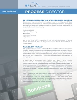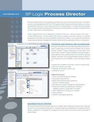 BP Logix Process Director is a web-based business process management software that allows business users to define, automate, manage and report on business processes without coding. It uses a graphical interface and predictive analytics to provide visibility into process times. Process Director integrates with existing systems and data sources, and can deploy processes faster and at lower costs than other BPM products.