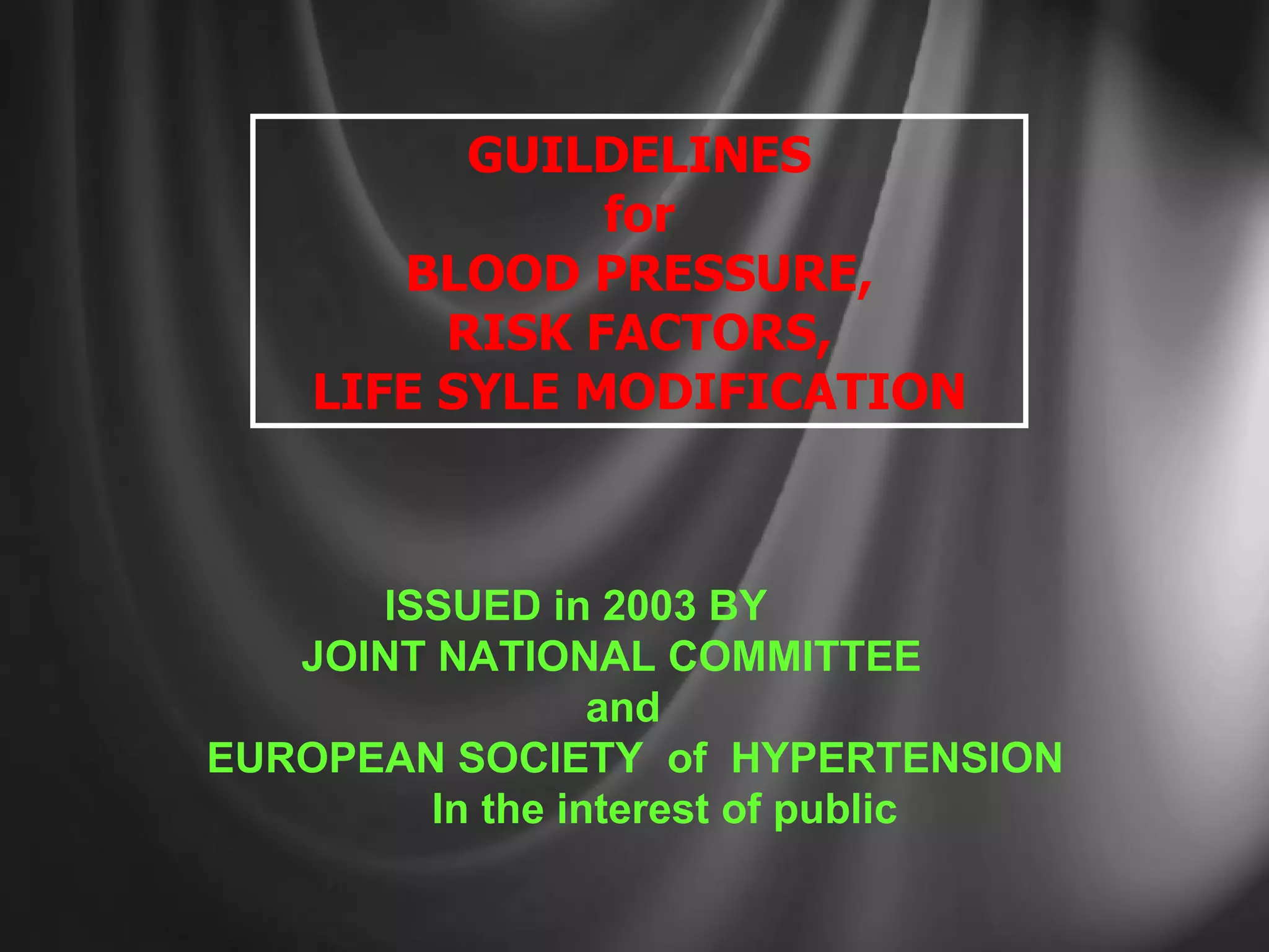 The document outlines guidelines from 2003 on blood pressure categories, risk factors, and lifestyle modifications to reduce hypertension. It defines normal and pre-hypertensive blood pressure levels. Major risk factors include family history, inactivity, obesity, smoking, age, and diabetes. Recommended lifestyle modifications are limiting alcohol, following a low-fat diet high in fruits and vegetables, maintaining a healthy weight, engaging in regular physical activity, reducing salt intake, and not smoking.