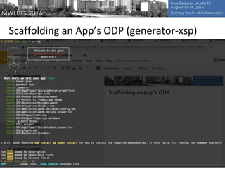 The document outlines various web development tools and technologies, including generators for different frameworks like Angular and Vue. It discusses back-end and front-end integration, emphasizing automation in development processes. Additionally, it suggests modifications to development and build scripts for better output management.