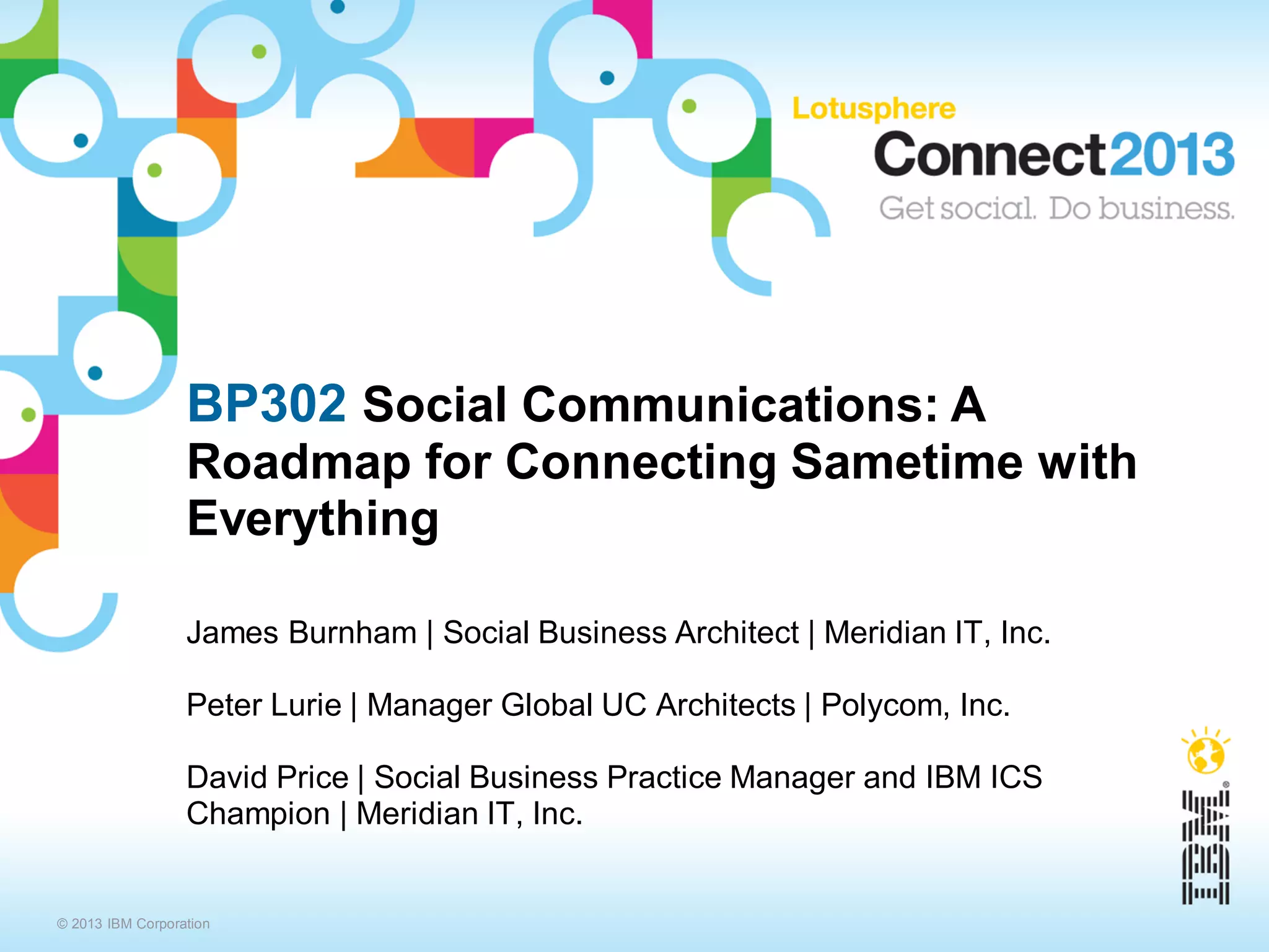 The document outlines a roadmap for integrating IBM Sametime with various communication platforms to enhance unified communications (UC) within organizations. It discusses essential decisions and best practices for unifying audio, video, and telephony systems while providing real-world examples of implementations and key speakers' insights. The presentation also emphasizes the importance of understanding an organization's current needs and selecting appropriate technologies to drive effective collaboration.