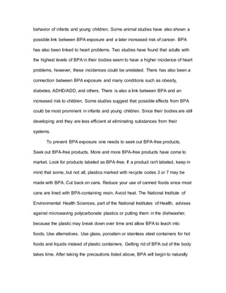 Bisphenol A (BPA) is a chemical used to make polycarbonate plastics and epoxy resins. It is found in many consumer products like food containers, water bottles, and dental sealants. Most human exposure to BPA comes from eating food or drinking beverages that have leached BPA from protective coatings. BPA is an endocrine disruptor that mimics estrogen and has been linked to negative health effects in animal studies such as brain, behavior, and cancer risks. To reduce exposure, people should seek out BPA-free products and limit canned foods and plastic containers since BPA can leach out during heating.
