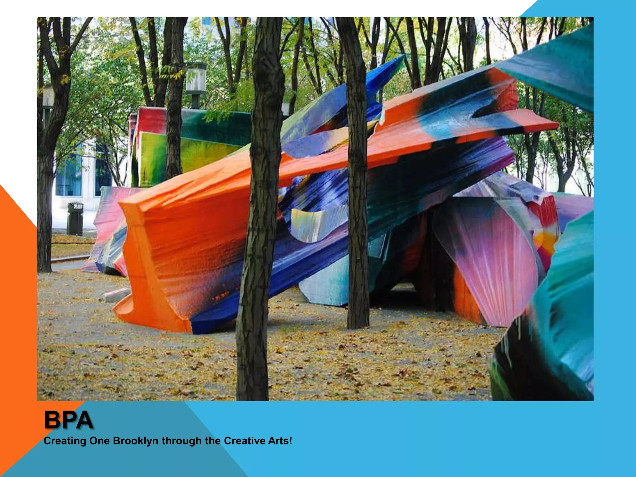 The document discusses the potential for creating public art districts in Brooklyn using existing parks and open spaces to stimulate economic growth and community engagement through the arts. It highlights the importance of fostering partnerships, providing affordable resources for artists, and making the arts accessible to promote a more vibrant urban environment. Additionally, it emphasizes the collaborative efforts of curators Savona Bailey-McClain and Scherezade Garcia to transform distressed communities in Brooklyn into thriving cultural hubs.