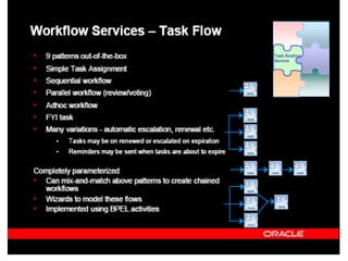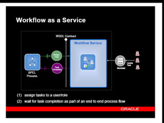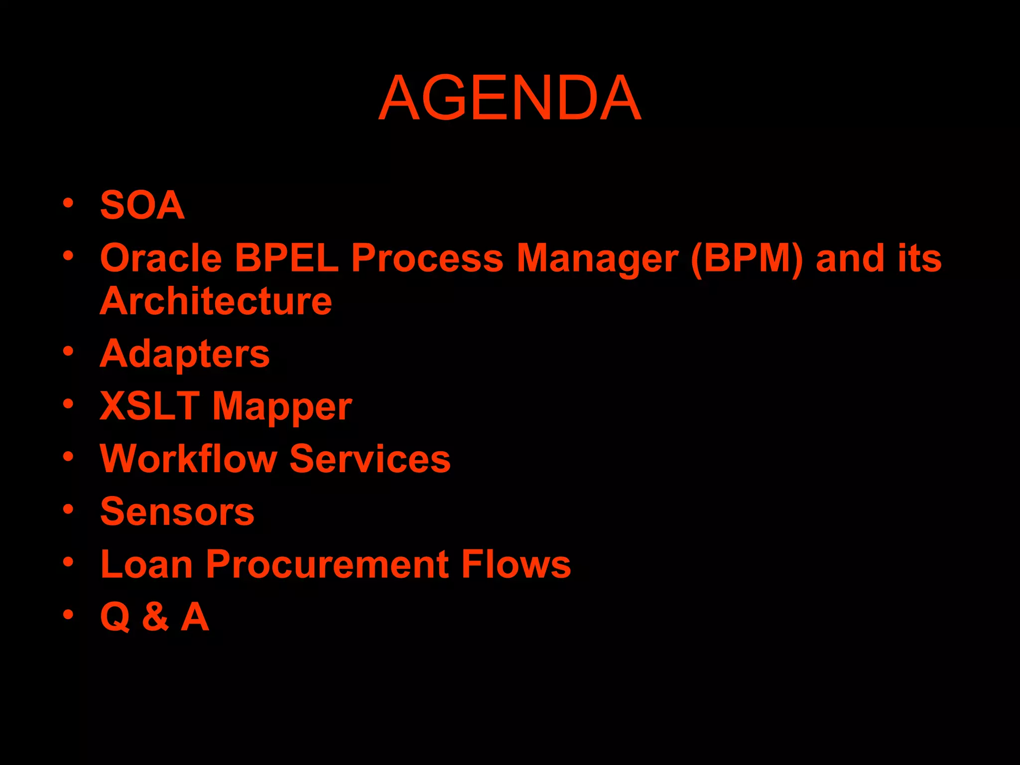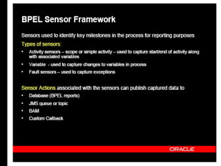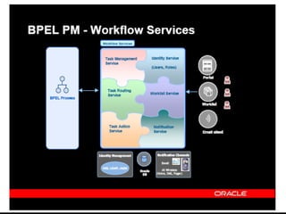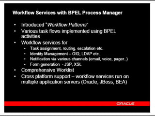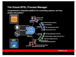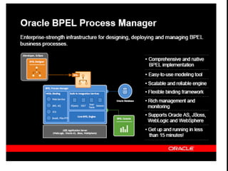 The document discusses Oracle BPEL Process Manager and its architecture. It provides an overview of key components of BPEL including the BPEL designer, BPEL server, BPEL console, and various adapters. It also includes a sample loan procurement process flow and is available for questions.