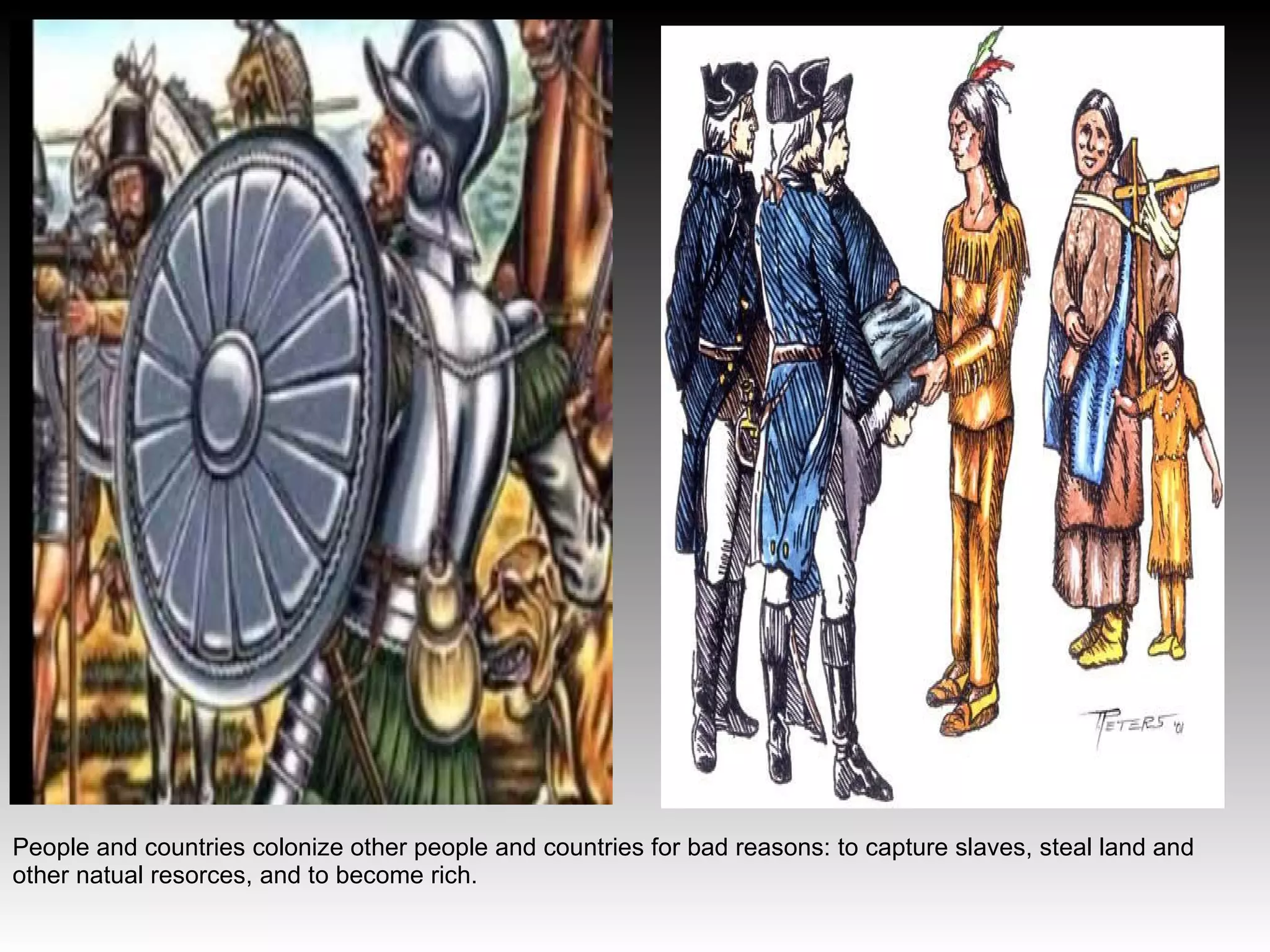 The document discusses the negative reasons and impacts of colonization. It provides examples of how the Spanish colonized parts of the Americas to capture slaves and steal land and resources to become wealthy. As a result, many Latin Americans today have mixed European and Native American ancestry. Similarly, the English colonized what is now the United States, stealing land and bringing women but not enslaving Native Americans as they had African slaves. Colonized peoples often adopted the colonizers' language and religion as globalization spread traditional cultures worldwide.