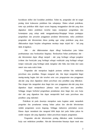 Dokumen tersebut membahas tentang pengenalan alat-alat laboratorium yang digunakan dalam praktikum bahan pakan dan formulasi ransum. Pengenalan alat-alat laboratorium dijelaskan penting untuk keselamatan dan kelancaran praktikum. Berbagai jenis alat laboratorium dan cara penggunaannya juga diuraikan secara singkat.