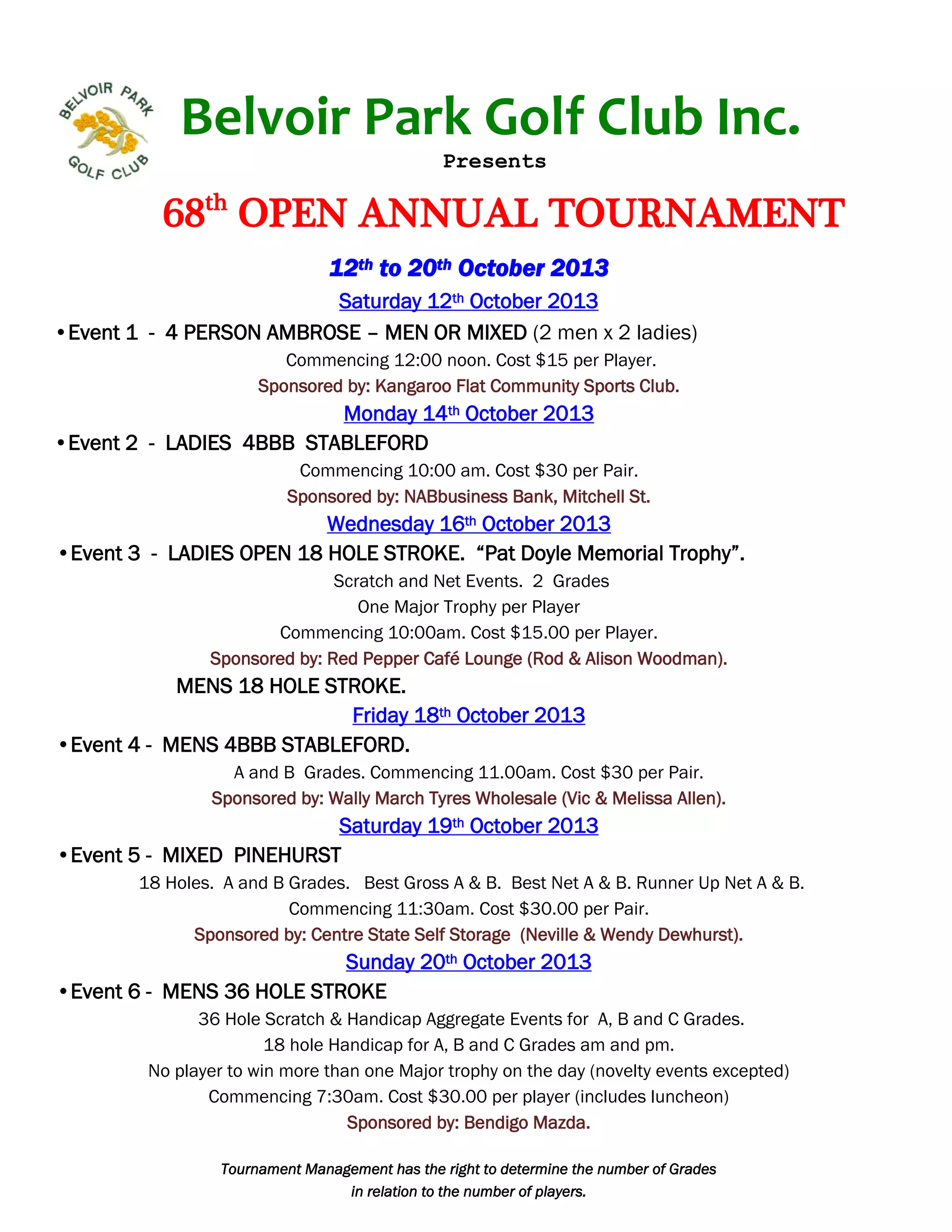 The Belvoir Park Golf Club is hosting its 68th annual open tournament from October 12th to 20th, 2013. The tournament includes 6 events of varying formats, including ambrose, stableford, stroke play and match play competitions for men, women and mixed groups. Event sponsors are listed and each event provides information on starting time, format, cost and prizes. The final event on October 20th is a men's 36 hole stroke play competition across A, B and C grades with morning and afternoon rounds.