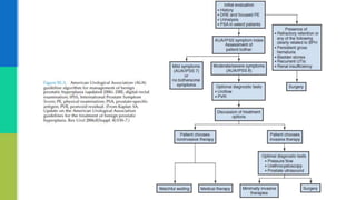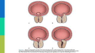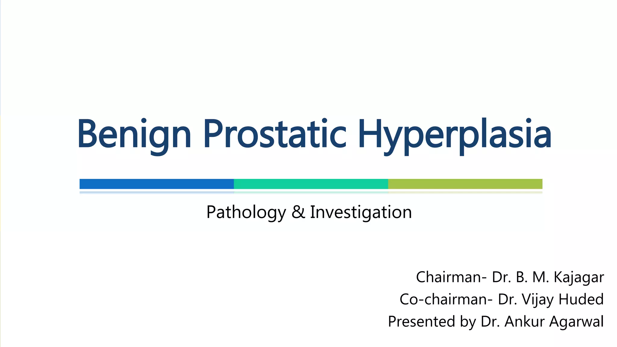 This document provides an overview of benign prostatic hyperplasia (BPH) including its etiology, pathology, clinical findings, and investigation. It notes that BPH begins as microscopic nodules in the transitional zone of the prostate that can grow and compress surrounding tissue. Common symptoms include urinary frequency, urgency, and nocturia. Evaluation involves assessment of lower urinary tract symptoms, digital rectal exam, urinalysis, post-void residual measurement, and in some cases urodynamic testing. BPH is a common condition among older men that results from changes in hormone levels and growth factors.