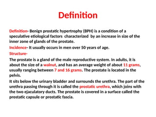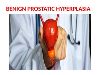Benign prostatic hyperplasia (BPH) is a condition characterized by the enlargement of the prostate gland, primarily affecting men over 50. The condition is associated with hormonal changes and can lead to bladder outlet obstruction, causing various urinary symptoms such as weak urine stream, hesitancy, and nocturia. Treatment options include medication (alpha blockers and 5-alpha reductase inhibitors) and surgical interventions, with potential complications arising from surgery.