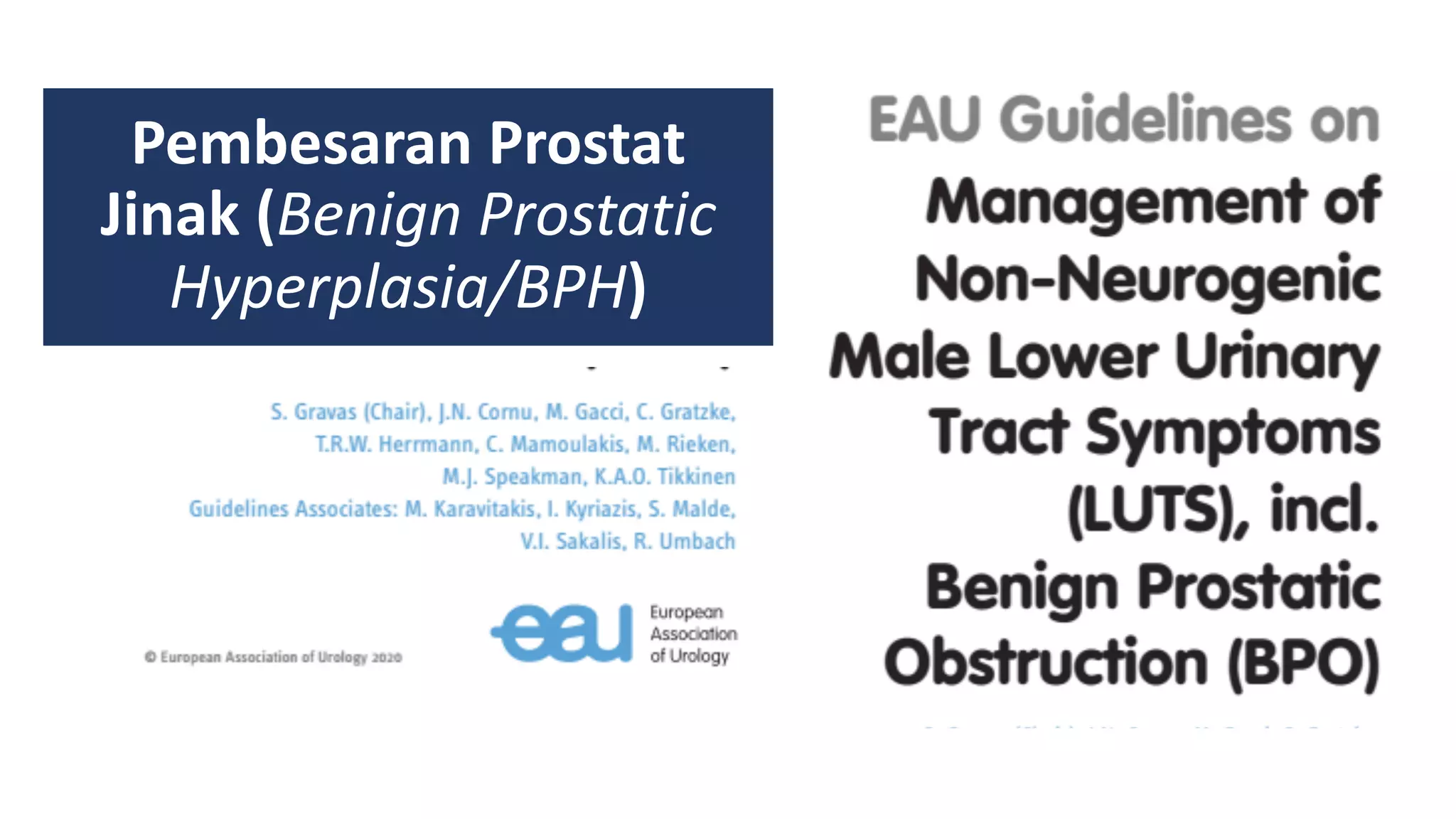 Dokumen ini membahas tentang pembesaran prostat jinak (BPH) dan gejala yang terkait, serta berbagai metode diagnosis dan pengelolaannya. BPH sering menyebabkan obstruksi saluran kemih, dan penanganan meliputi pengawasan aktif, terapi obat, atau pembedahan berdasarkan keparahan gejala pasien. Diagnosis melibatkan anamnesis, penggunaan kuesioner, dan berbagai pemeriksaan fisik serta urodinamik untuk menilai keadaan kesehatan prostat dan saluran kemih.