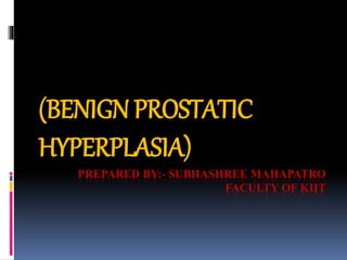 Benign prostatic hyperplasia (BPH) is a non-cancerous enlargement of the prostate, primarily influenced by aging and lifestyle factors. It leads to various urinary symptoms, complications, and requires diagnostic evaluations such as digital rectal examination and ultrasound, with treatment options including medications and surgical interventions. Nursing assessments identify subjective and objective data to address acute pain, urinary retention, and potential for infection.
