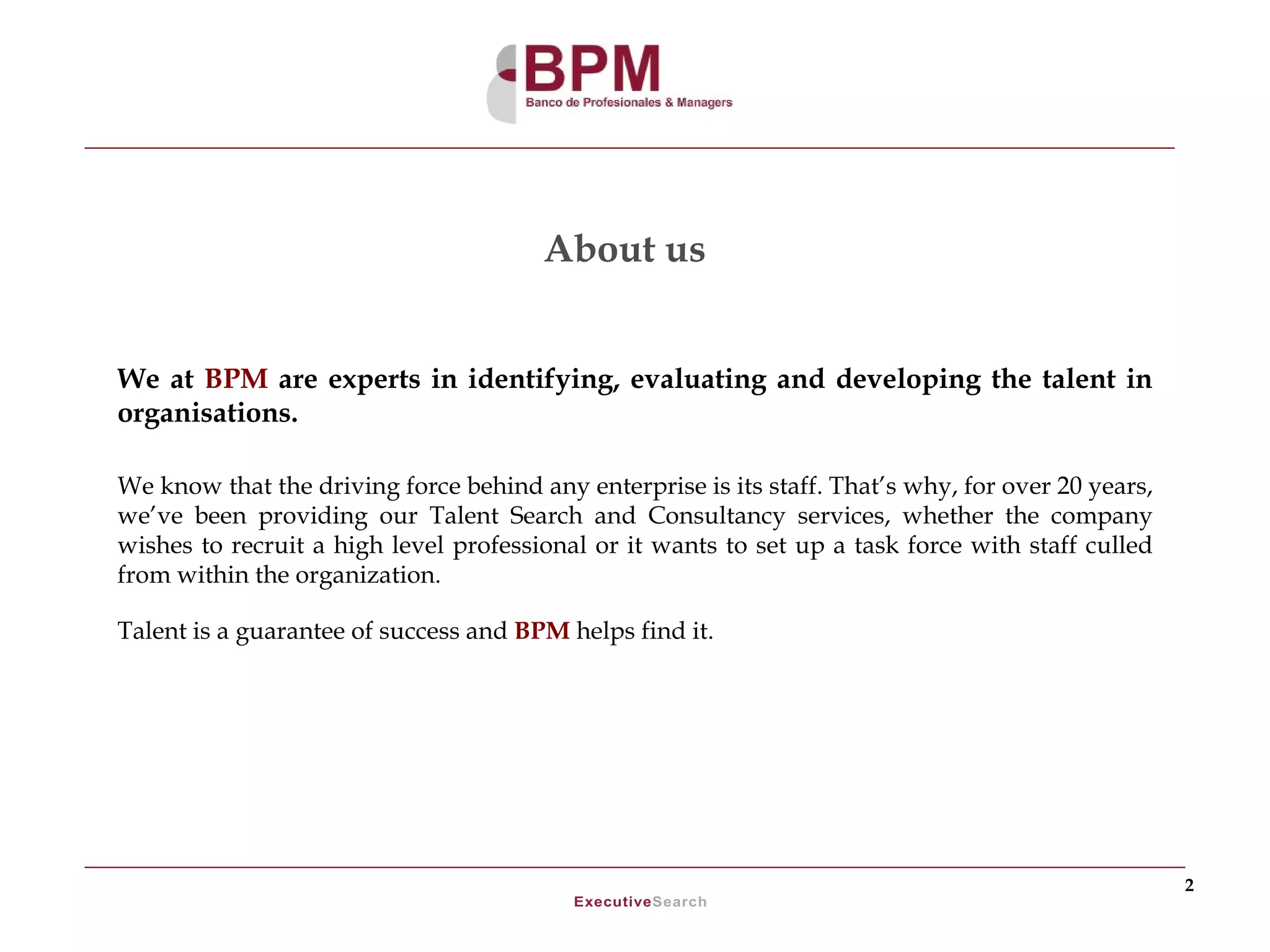 BPM is an executive search and talent consulting firm that has been operating for over 20 years. They help companies recruit high-level professionals and develop talent internally. BPM focuses on identifying, evaluating, and developing talent for their clients across a variety of industries including consumer goods, media, advertising, finance, and more. Their services include executive search, interim management, assessment centers, and coaching/training. BPM prides itself on confidentiality, quality service, and long-term client relationships.