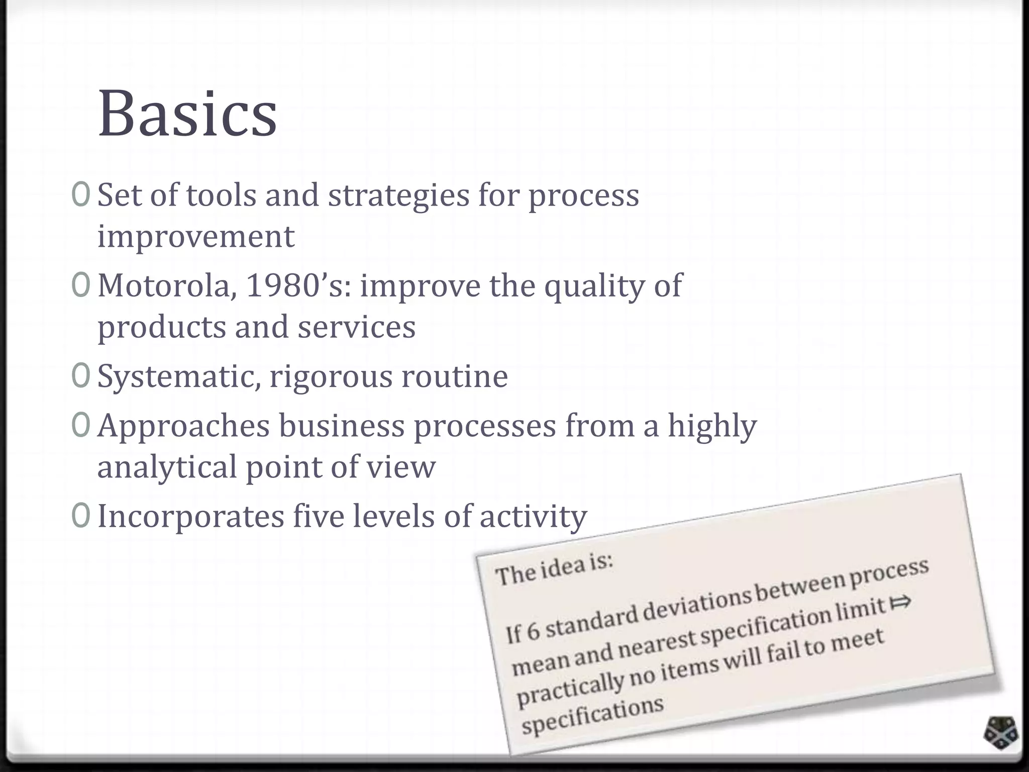 This document provides an overview of Six Sigma, a set of tools and strategies used for process improvement. It was developed by Motorola in the 1980s to improve quality. Six Sigma uses data-driven methods like DMAIC (Define, Measure, Analyze, Improve, Control) to reduce process variability and defects. It aims for near-perfect performance of 3.4 defects per million opportunities. The document also discusses how Six Sigma can be combined with business process management to prioritize improvement projects, remove waste, and monitor changes across an organization.