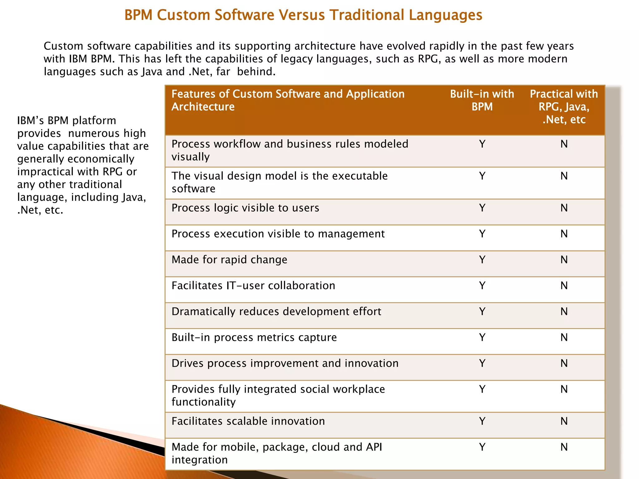 The document discusses the advantages of IBM BPM over traditional programming languages like RPG, COBOL, Java, and .NET for developing custom software and applications. It emphasizes BPM's capabilities in accelerating change, enabling collaboration, and enhancing transparency, which leads to improved process metrics and innovation. The BPM platform allows for a more integrated and efficient development process, aligning with modern business needs for rapid adaptation and market response.