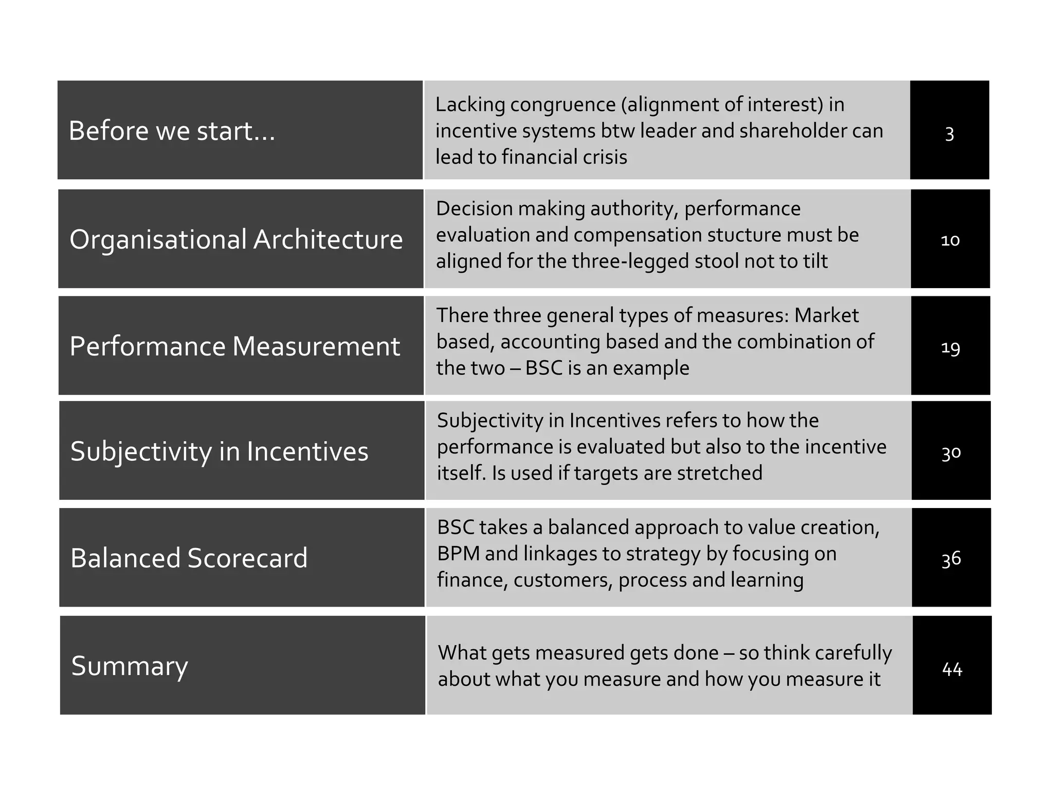 The document discusses performance measurement and management. It describes the balanced scorecard approach which takes a balanced view of value creation by focusing on financial, customer, internal process and learning/growth perspectives. It also discusses using a combination of objective and subjective measures to evaluate performance, as no single measure can fully reflect performance. Subjectivity in incentives may be used when targets are difficult to achieve or quantify, or when there are interdependencies between departments. Organizational architecture must balance decision rights, performance evaluation and compensation structures to properly incentivize employees.