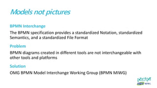 The BPMN Interchange Capability Demonstration addresses the lack of interoperability among BPMN diagrams created in different tools. The BPMN Model Interchange Working Group (MIWG) is dedicated to promoting the interchange of BPMN models through initiatives like test cases, validation, and guidelines. It has verified BPMN 2.0 reference models and conducted public capability demonstrations to showcase improvements and resolve tool issues.