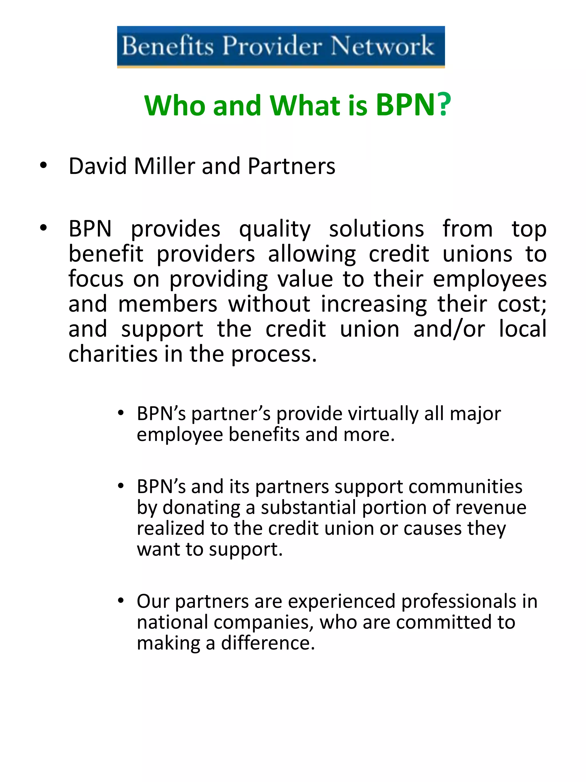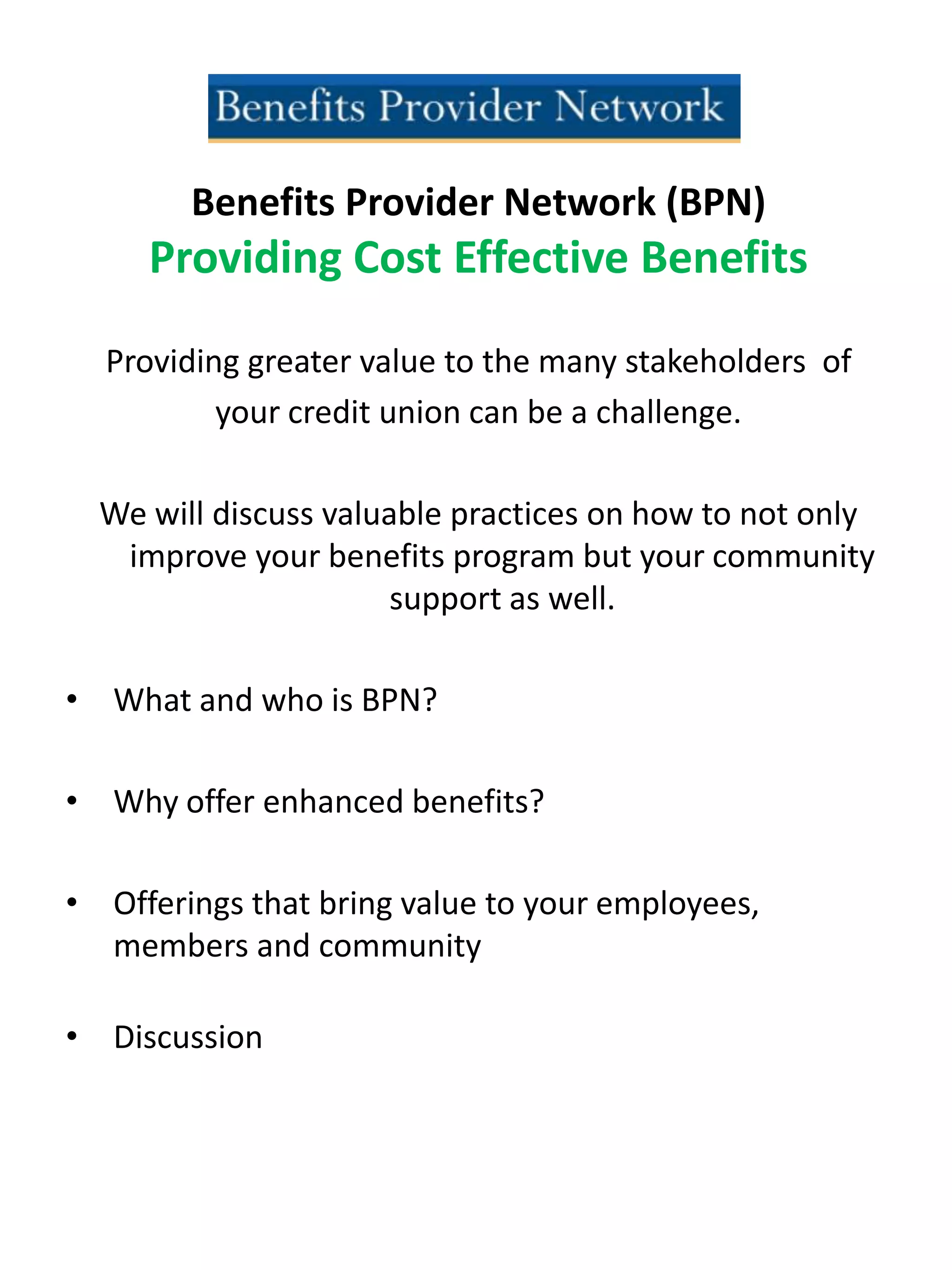Benefits Provider Network (BPN) works with credit unions to provide enhanced benefits to employees and members at low or no additional cost to the credit union. BPN partners with top benefits providers to offer supplemental insurance, major medical, discount medical programs, legal services, energy savings programs, home buying services, and more. These additional offerings help credit unions improve their benefits programs, increase value for stakeholders, generate revenue, and support local communities and charities. BPN ensures credit unions have access to high-quality benefits solutions while reducing costs and administrative burdens.