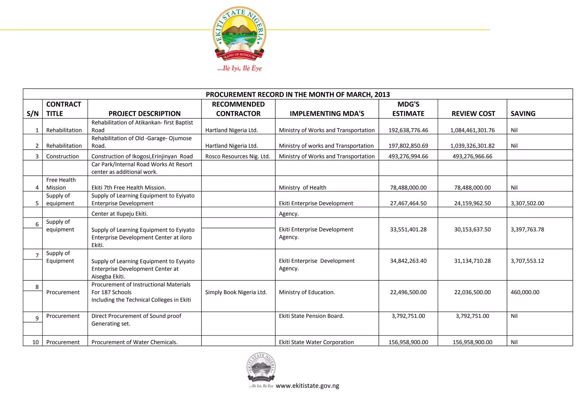1. The document summarizes procurement records for the month of March 2013 in Ekiti State, including 33 construction, supply, and service contracts totaling over N7.6 billion in estimated costs.