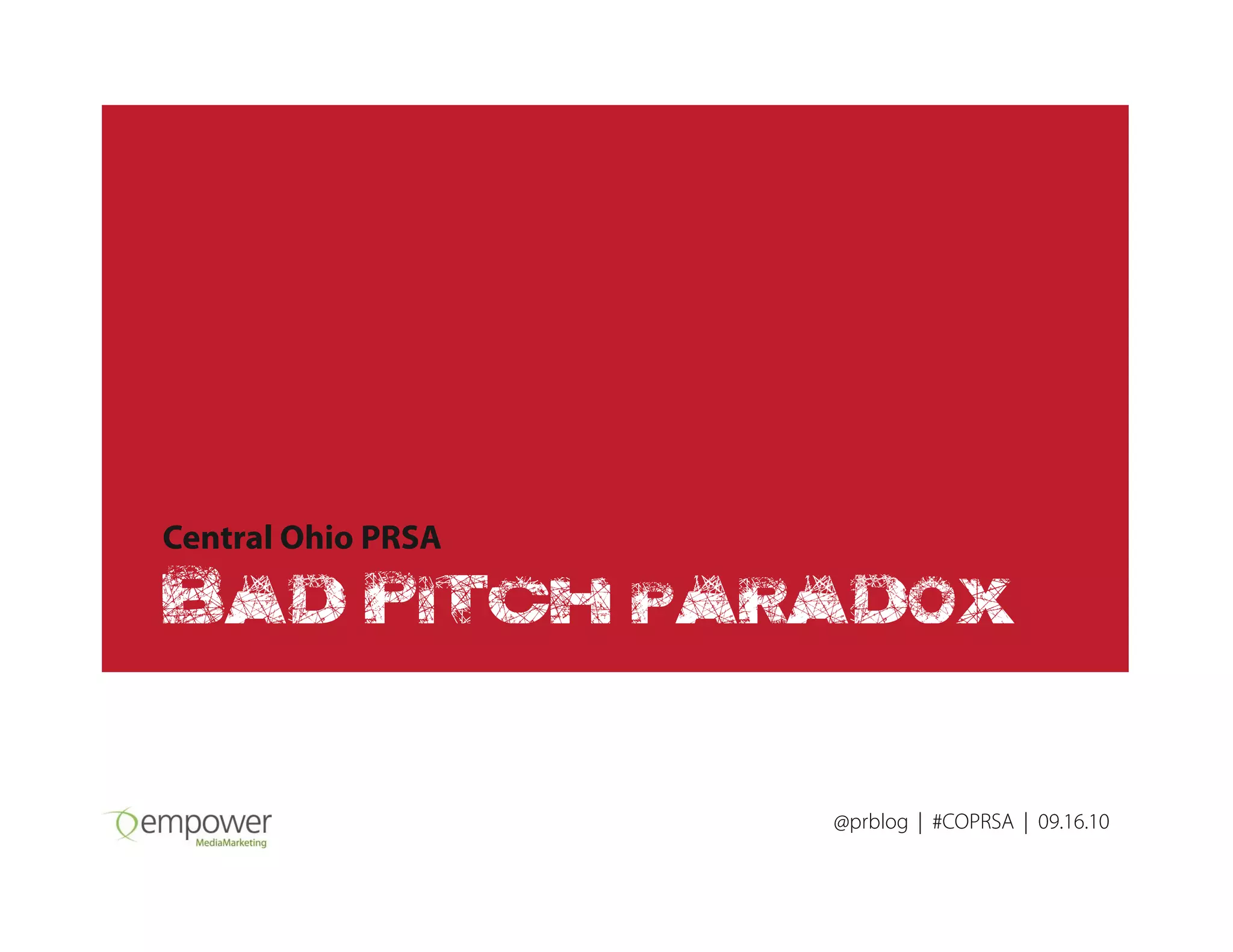 The document discusses the challenges of public relations, particularly focusing on ineffective pitches and the importance of building relationships with bloggers and media. It emphasizes the need for a community-centric approach in blogger outreach, along with utilizing social media and organic search for greater visibility. Strategies include engaging with targeted bloggers, leveraging existing relationships, and encouraging authentic content creation to enhance brand awareness and participation.