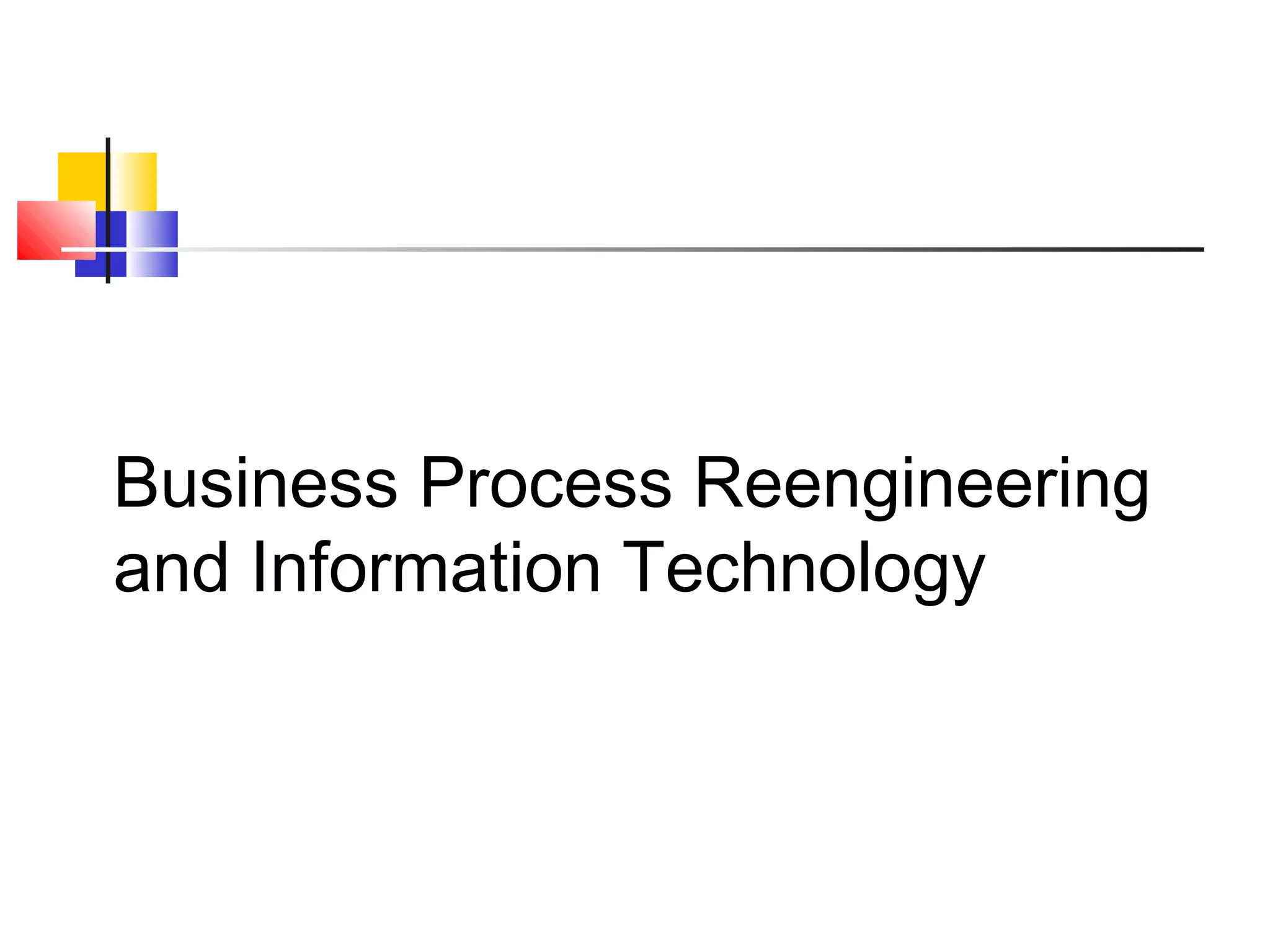 The document discusses business process reengineering and the role of information technology. It covers several key points: