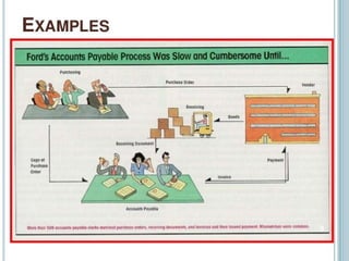 3) Examples are provided of how companies like Walmart and Ford redesigned their processes using IT to improve efficiency, effectiveness, and transformation. Principles of BPR like organizing around outcomes and linking parallel activities are also outlined.