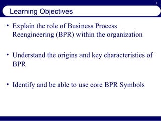 BPR seeks to fundamentally rethink and redesign business processes to achieve dramatic improvements in key areas like cost, quality, and speed. It differs from process simplification or continuous improvement in aiming for radical rather than incremental change. Successful BPR requires selecting the right process, appointing a project team, understanding the current process, developing a vision for improvement, creating an action plan, and executing that plan while overcoming typical challenges. Information technology can both help implement new processes and drive further innovation.