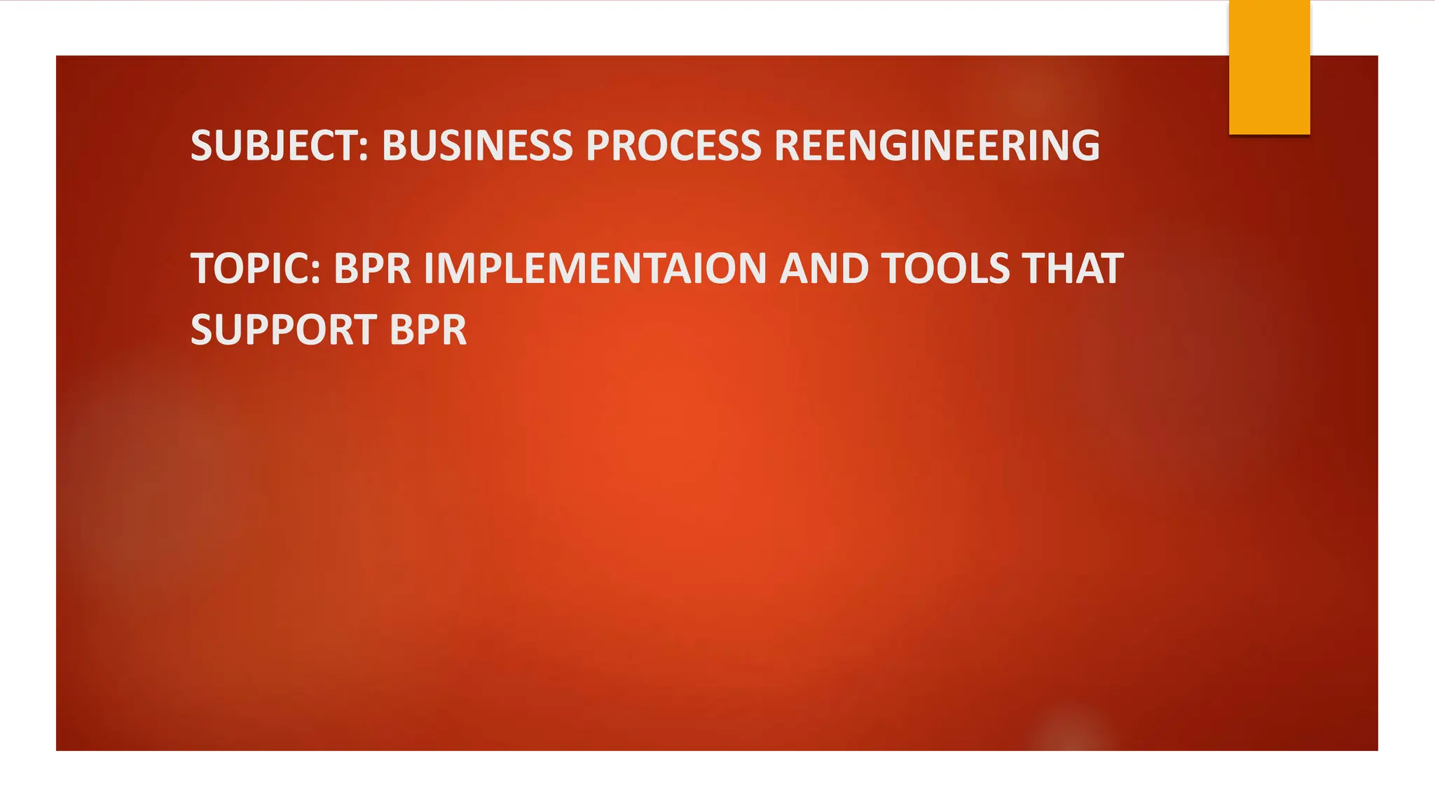 3. Key tools that support successful BPR implementation include focusing on customers and processes, visualizing and benchmarking end processes, change management to address human impacts, and business process mapping to understand existing processes.