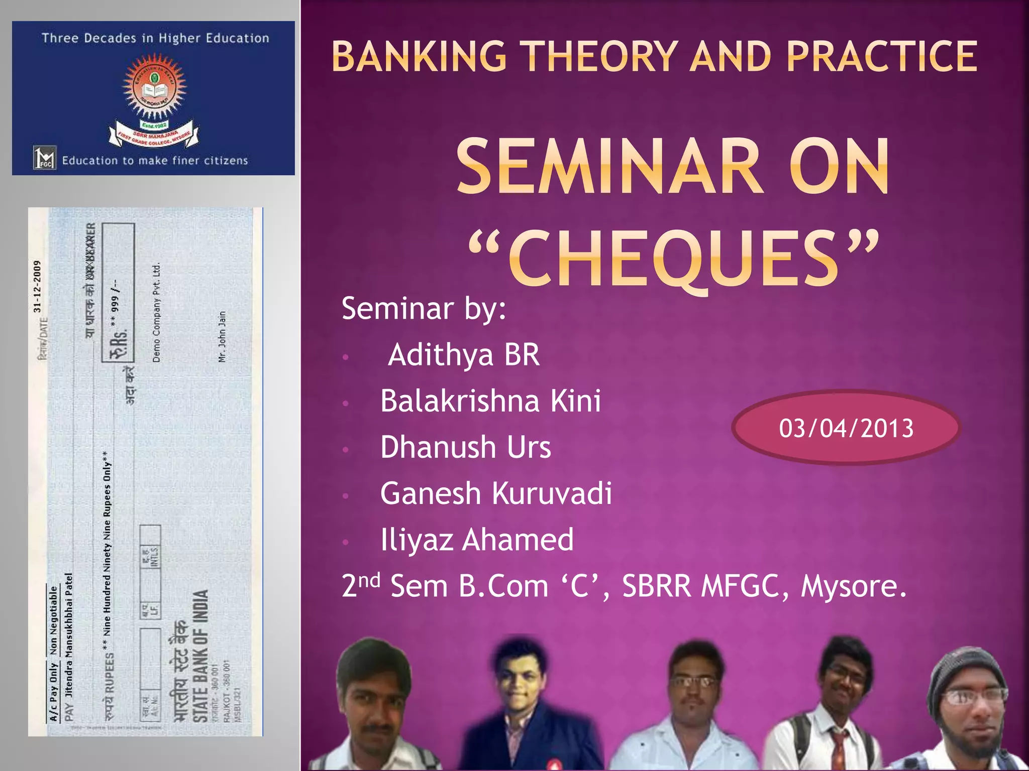 This document summarizes a seminar on cheques given by five students. It defines a cheque, outlines the essential features of a valid cheque, and describes the different types of cheques. It also discusses endorsement of cheques, the roles and responsibilities of a paying banker and collecting banker, circumstances for dishonoring a cheque, and the protections provided to paying and collecting bankers under Indian law.