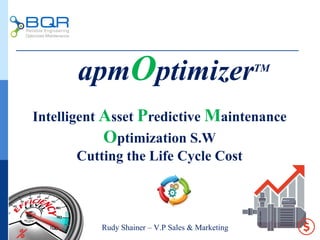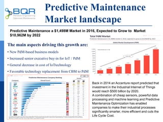The document discusses the growth and benefits of predictive maintenance solutions, highlighting a market expectation of over $10 billion by 2022. It emphasizes the cost-saving potential of optimizing maintenance and reducing downtime, which can cut overall life cycle costs by up to 10%. APMOptimizerTM is presented as a tool for enhancing reliability and efficiency in industrial operations through data analysis and predictive maintenance strategies.