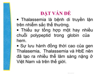 Luận văn thạc sỹ y khoa nghiên cứu thực trạng bệnh thalassemia tại bệnh viện trẻ em Hải Phòng, chỉ ra rằng thalassemia là bệnh di truyền phổ biến ở Việt Nam với nhiều thể bệnh nặng. Kết quả cho thấy bệnh thalassemia chiếm tỷ lệ cao trong số bệnh nhân nhập viện, tuy nhiên việc điều trị không đạt hiệu quả theo tiêu chuẩn quốc tế, dẫn đến nhiều biến chứng cho bệnh nhân. Đặc biệt, có tới 87,1% bệnh nhân gặp biến dạng xương và 96,4% có biểu hiện lách to.