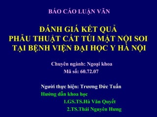 Báo cáo đánh giá kết quả phẫu thuật cắt túi mật nội soi tại bệnh viện Đại học Y Hà Nội cho thấy phương pháp này an toàn, ít biến chứng và có thời gian hồi phục nhanh. Nghiên cứu tiến hành từ 2008 đến 2011, phân tích các đặc điểm lâm sàng và cận lâm sàng của bệnh nhân. Kết quả cho thấy tỷ lệ thành công cao, với 97,6% bệnh nhân hồi phục tốt.