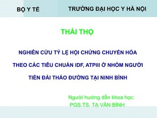 Nghiên cứu này nhằm xác định tỷ lệ hội chứng chuyển hóa theo tiêu chuẩn IDF và ATP III ở nhóm người tiền đái tháo đường tại Ninh Bình. Hội chứng chuyển hóa là tập hợp các yếu tố nguy cơ liên quan đến đái tháo đường typ 2 và bệnh tim mạch, gây tăng nguy cơ mắc bệnh tới 5 lần. Sử dụng mẫu 948 người từ 30-69 tuổi, nghiên cứu thu thập thông tin về nhân trắc, tiền sử bệnh và các xét nghiệm đường huyết, lipid máu.