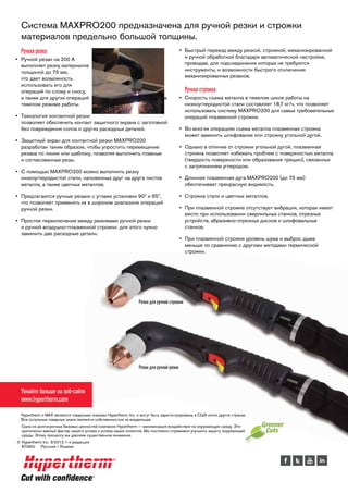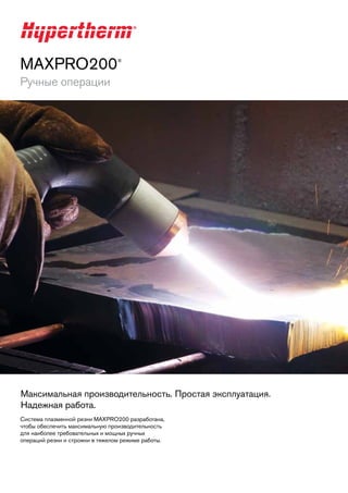 Система плазменной резки maxpro200 предназначена для ручной резки и строжки материалов большой толщины, обеспечивая высокую производительность и надежную работу. Устройство позволяет быстро переключаться между различными режимами обработки и отлично подходит для операций слома и сноса. Кроме того, maxpro200 минимизирует воздействие на окружающую среду, что является одним из ключевых приоритетов компании Hypertherm.