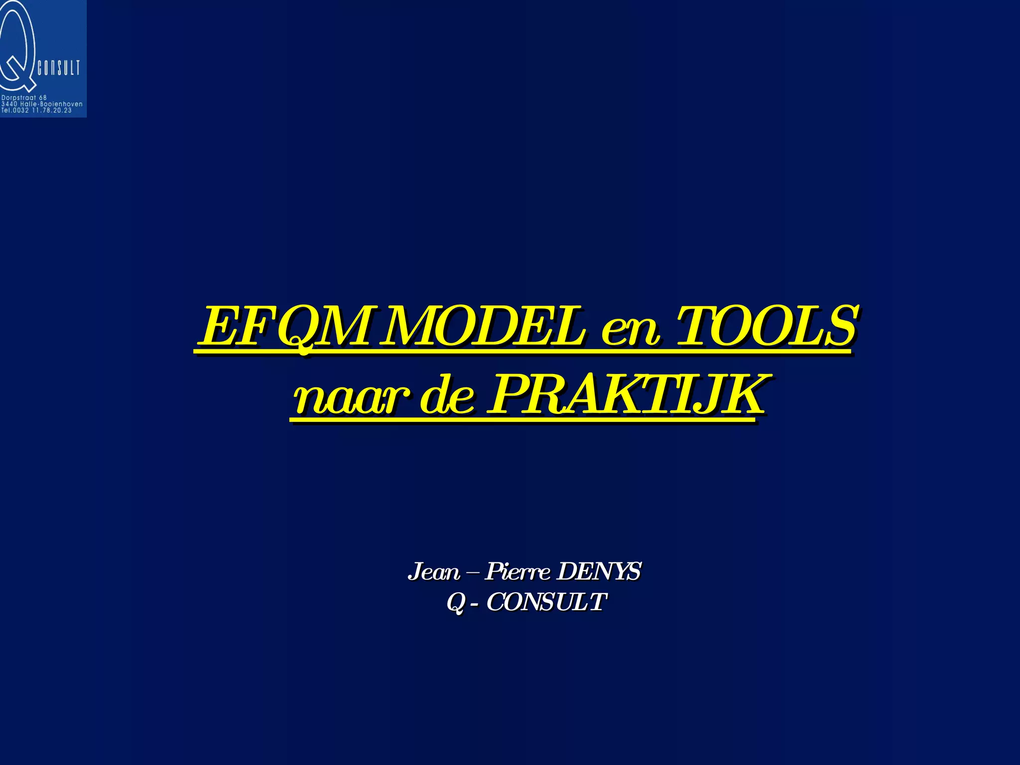 Succesvol …? Internationalereferentie maar toch geen wondermiddel alomvattende, methodische en regelmatige review van de activiteiten en resultaten van een organisatie zwakke EN sterke punten ==> scores implementatie van verbeteringsplannen tijd, methode, scherpzinnigheid, creativiteit en veel doorzettingsvermogen ….