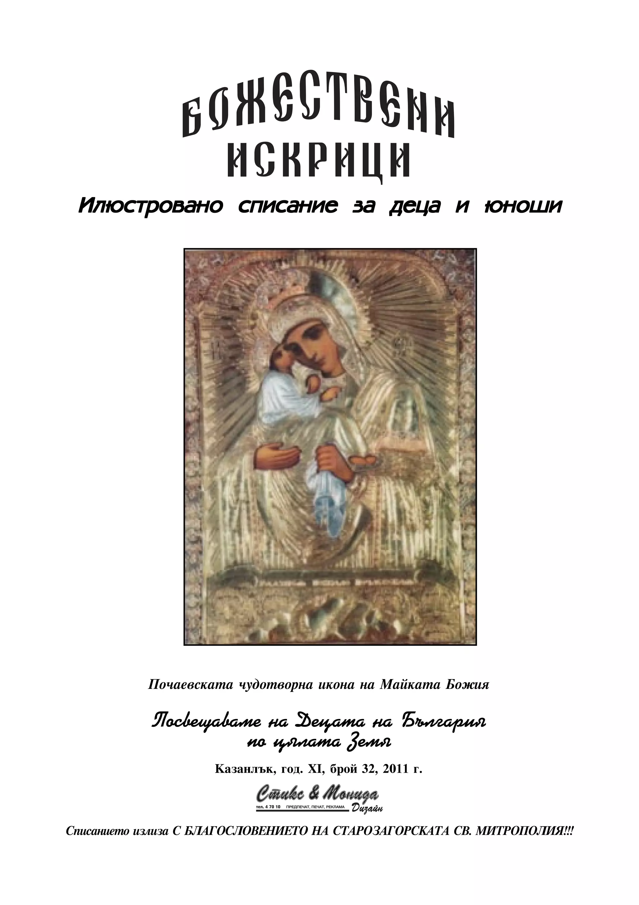 äåöà è þíîøè Ïî÷àåâñêàòà ÷óäîòâîðíà èêîíà íà Ìàéêàòà Áîæèÿ Ïîñâåùàâàìå íà Äåöàòà íà Áúëãàðèÿ ïî öÿëàòà Çåìÿ Êàçàíëúê, ãîä. XI, áðîé 32, 2011 ã. Ñïèñàíèåòî èçëèçà Ñ ÁËÀÃÎÑËÎÂÅÍÈÅÒÎ ÍÀ ÑÒÀÐÎÇÀÃÎÐÑÊÀÒÀ ÑÂ. ÌÈÒÐÎÏÎËÈß!!!
