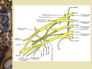 The document discusses the brachial plexus, which is formed by the anterior rami of cervical and upper thoracic spinal nerves. It describes the roots, trunks, divisions, cords and branches of the brachial plexus. Common brachial plexus injuries are also summarized, including their causes, types, investigations, treatments, and specific injuries like Erb's palsy and Klumpke's paralysis.