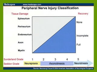 This document summarizes brachial plexus injuries in neonates. It discusses the epidemiology, anatomy, pathogenesis, clinical manifestations, diagnostic workup, management, prognosis, and references for brachial plexus injuries. Brachial plexus injuries affect 0.5-1.9 per 1000 live births and are most commonly caused by shoulder dystocia during delivery, stretching and damaging the brachial plexus nerves. Clinical signs depend on the specific nerves injured but may include limited arm movement and hand grasp. Management involves initial rest and positioning of the infant, with potential later surgery and physical therapy if nerve damage does not improve on its own. Prognosis is generally good, with most infants recovering fully or with