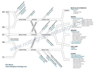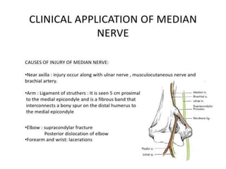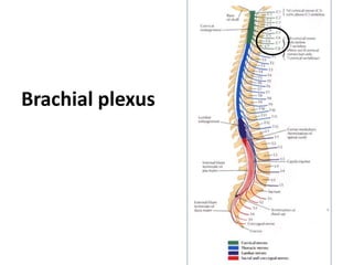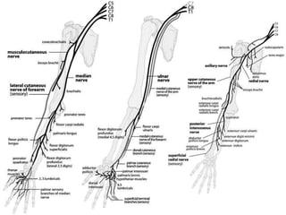 This document provides an overview of brachial plexus anatomy and injuries. It describes the components and branches of the brachial plexus. Various nerve injuries are discussed, including the effects on muscles, deformities caused, and potential disabilities. Specific nerves like the radial, ulnar, median, and musculocutaneous nerves have sections covering typical causes of injury, muscles paralyzed, and exam tests. Common conditions like carpal tunnel syndrome and Erb's palsy are summarized. Treatment involves specialized surgical options or allowing natural recovery. Brachial plexus blocks are performed via supraclavicular or axillary approaches.