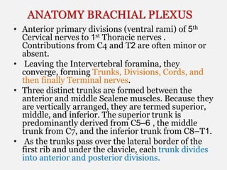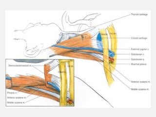 The document provides information about brachial plexus anatomy and different approaches for brachial plexus block, including interscalene, supraclavicular, infraclavicular, and axillary approaches. It discusses the anatomy relevant to each approach, positioning and needle placement techniques, methods for localizing nerves, injection procedures, expected durations and volumes of local anesthetic, and potential complications.