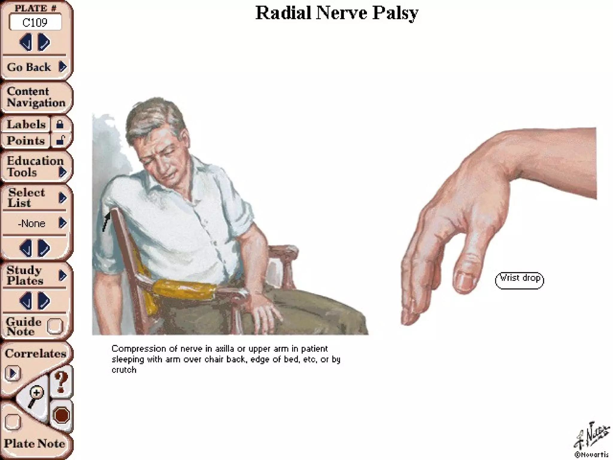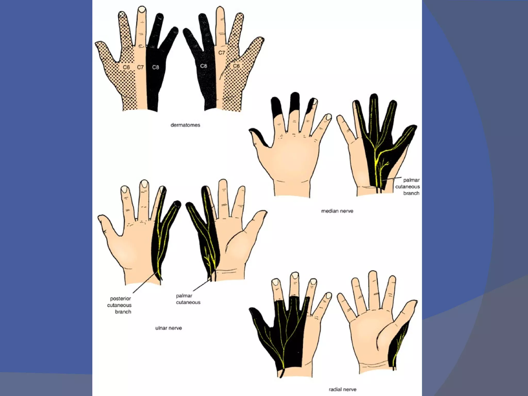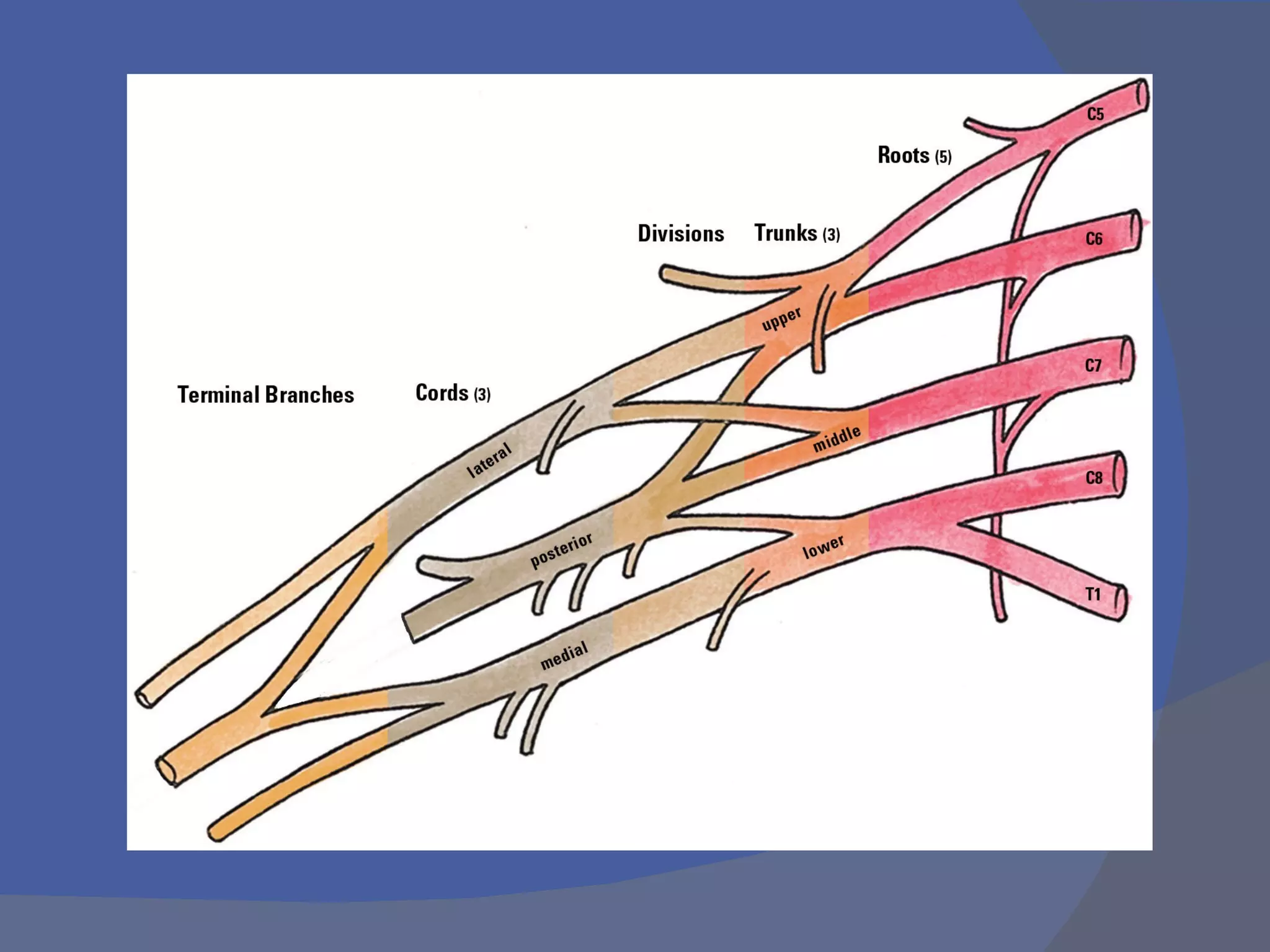 - The major nerves of the brachial plexus and their motor and sensory innervation, including the axillary, radial, musculocutaneous, ulnar, and median nerves.