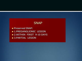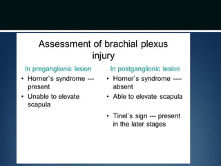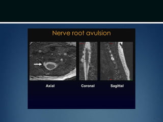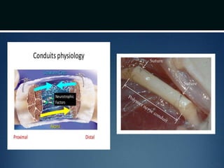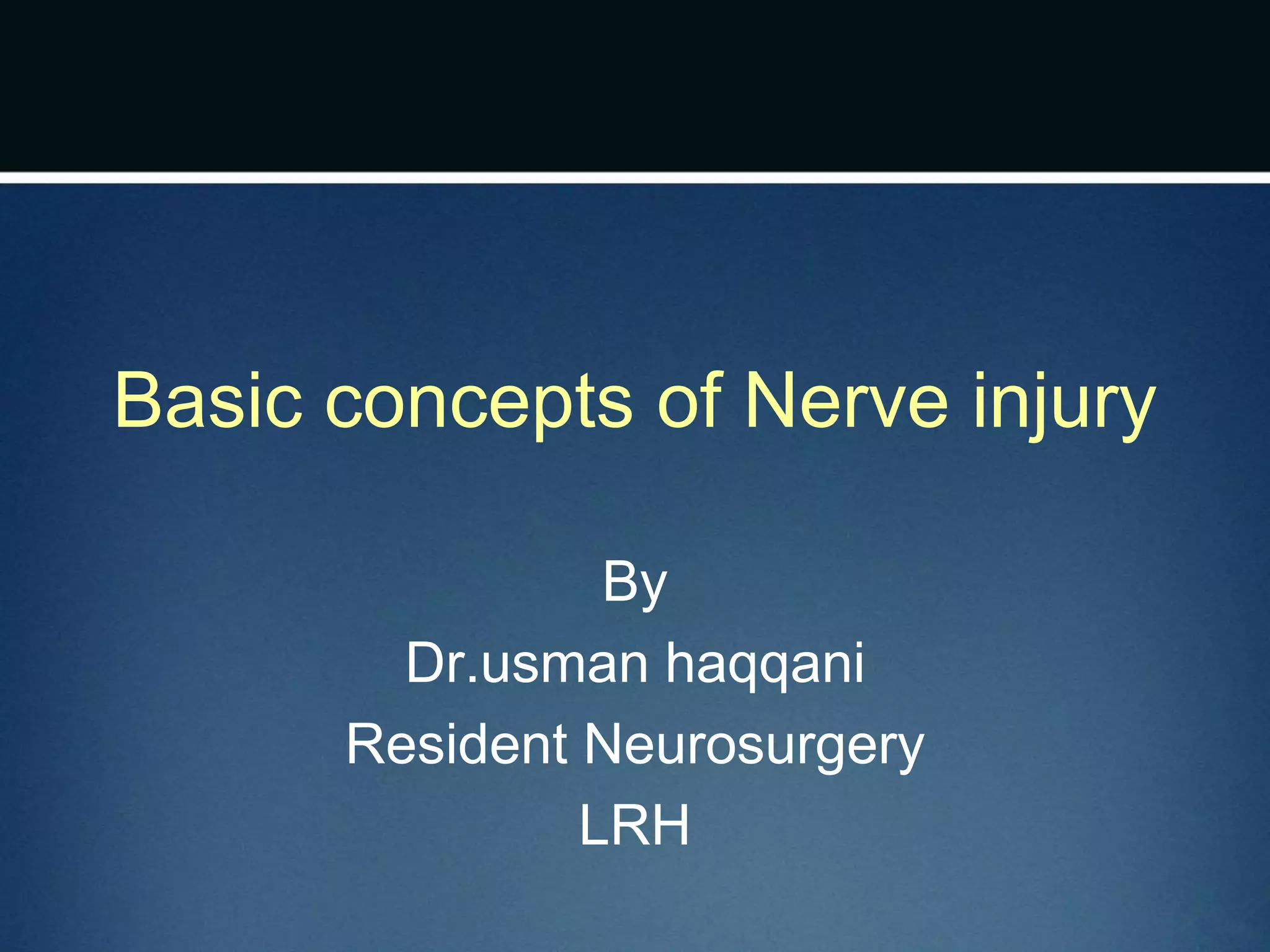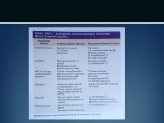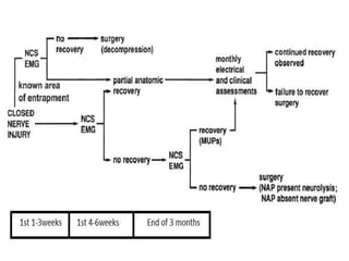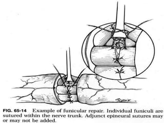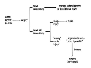 Nerve injuries can occur through various mechanisms and be classified based on severity. Electrodiagnostic studies and imaging help evaluate the degree of injury. For severe injuries, exploration may be needed for neurolysis, neurorrhaphy, grafting, or nerve transfers to restore function. The timing and type of surgical intervention depends on the severity, location, and symptoms in each individual case.