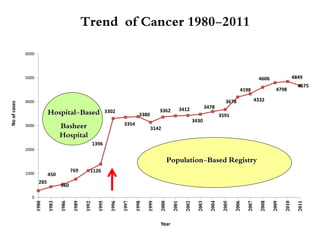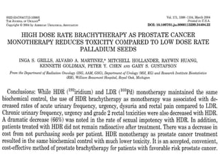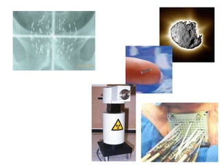 This document discusses brachytherapy, which is a type of radiation therapy where radioactive sources are placed inside or next to the area requiring treatment. It provides graphs showing trends in cancer cases in Jordan from 1980-2011, with the top ten cancers being lung cancer in males and breast cancer in females. It describes different methods of brachytherapy delivery including external beam radiation, intracavitary brachytherapy using an afterloader, prostate brachytherapy using ultrasound guidance, and gynecological template brachytherapy. Images show examples of brachytherapy applicators and planning as well as outcomes in patients treated for conditions such as facial nerve tumors and prostate cancer.