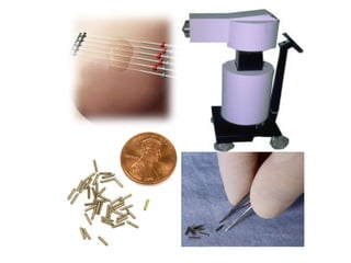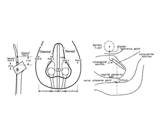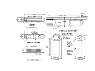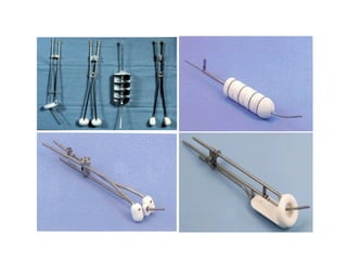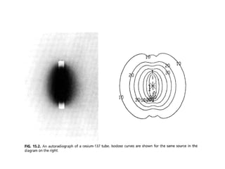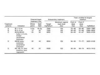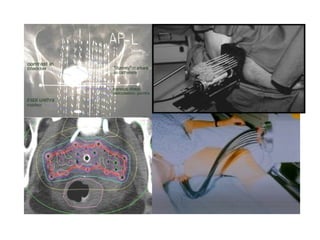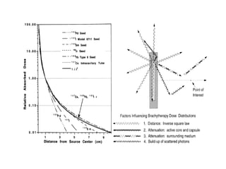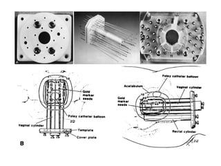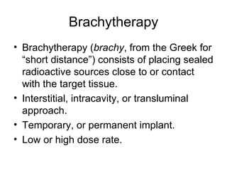 Brachytherapy involves placing radioactive sources close to or in contact with the target tissue and can be used to treat gynecological cancers. Common radioactive sources include radium-226, cesium-137, cobalt-60, iridium-192, and iodine-125. Brachytherapy is often used in combination with external beam radiation therapy and can be given as low dose rate brachytherapy over many hours or high dose rate brachytherapy over minutes. It allows high doses of radiation to be delivered to the tumor while sparing surrounding healthy tissues.